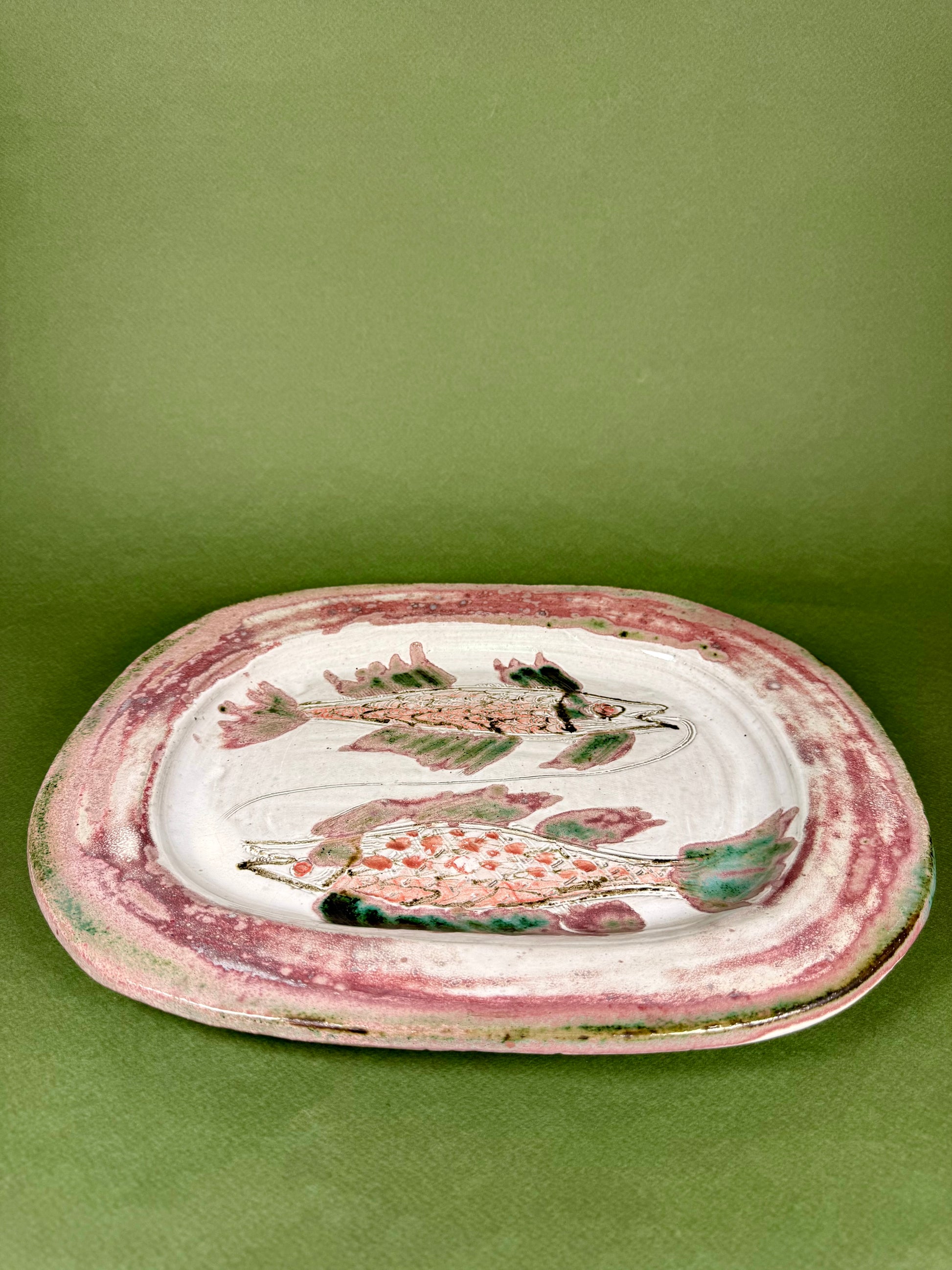Unique hand-painted ceramic platter signed by Albert Thiry and dated 1997. Decorated with two stylized fish in shades of pink, green, and white, framed by a textured border, this piece embodies the playful and decorative style of Albert Thiry, a renowned Vallauris ceramist. Its generous size and vibrant design make it perfect as a wall piece or a striking table centerpiece. A collectible work that reflects the artisanal tradition of French ceramics in the late 20th century.