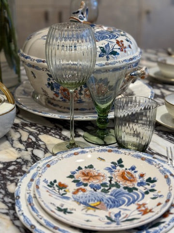 This exquisite porcelain set from the renowned French manufacture Faïencerie de Gien showcases the classic “Coq et Pivoine” (Rooster and Peony) motif. Celebrating timeless elegance and French country charm, each piece features vibrant, intricately hand-painted scenes depicting proud roosters among lush, blooming peonies. Crafted with meticulous attention to detail, the set embodies the enduring craftsmanship and heritage of Gien, making it a refined choice for elevating your table with authentic French sophistication.