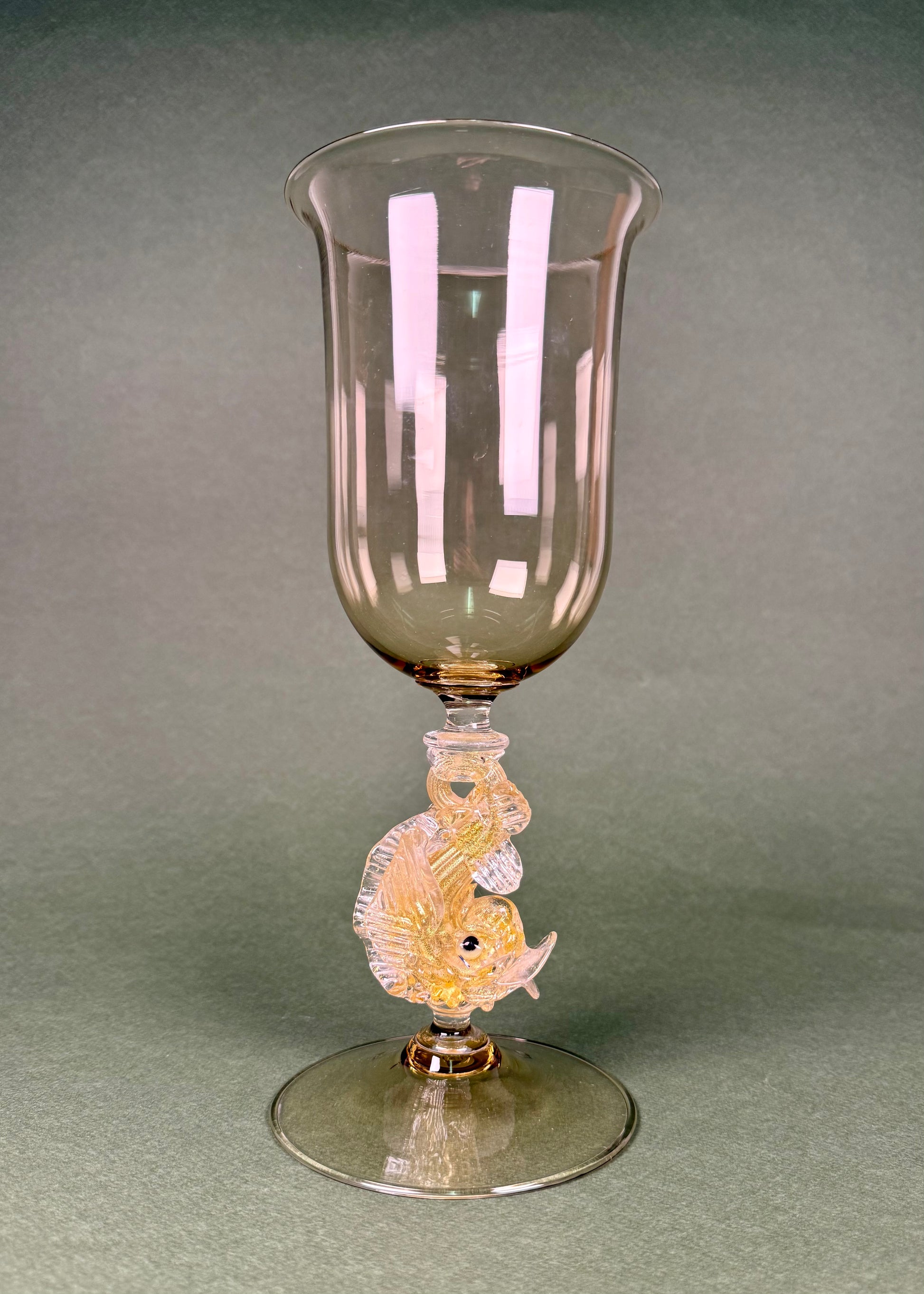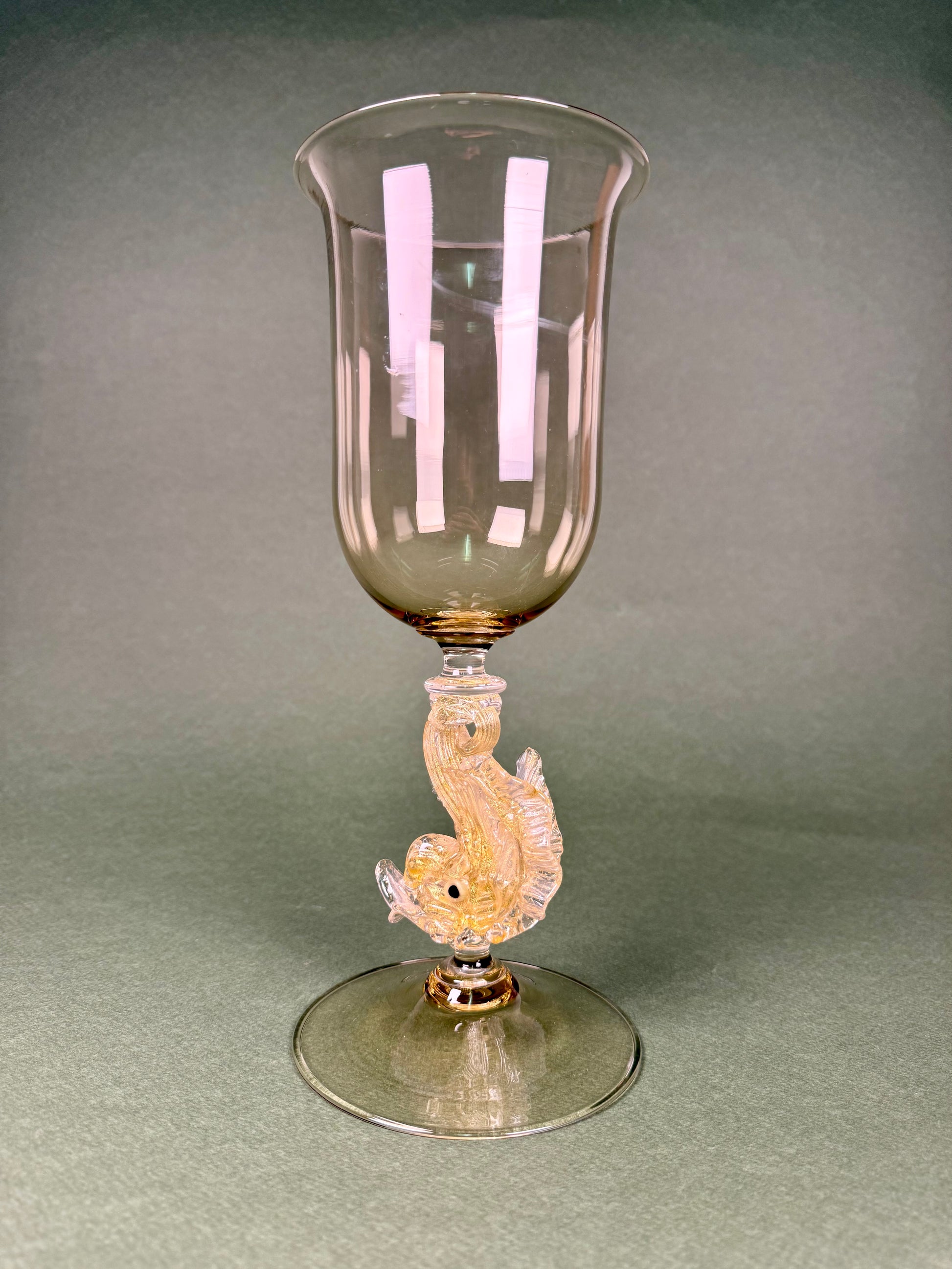Elegant hand-blown Murano-style goblet, dating from the 1950s. The amber bowl is set atop a sculpted glass fish stem, detailed with gold inclusions and expressive features. A whimsical and collectible piece of mid-century Venetian glass artistry.