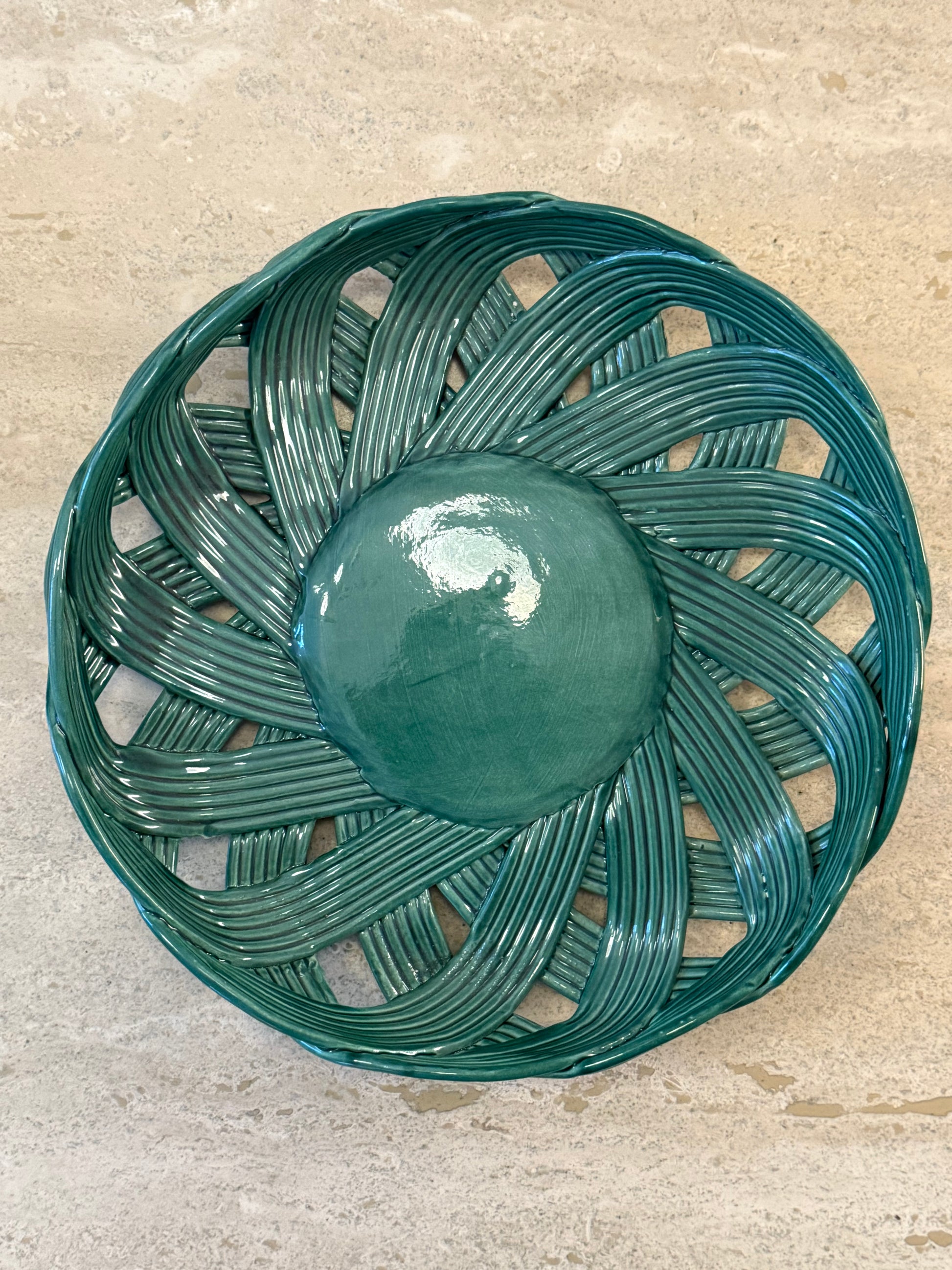 This striking large ceramic dish features an intricate woven basket–inspired design, entirely sculpted in glazed ceramic. The surface is composed of interlacing, ribbed strands that create a strong sense of movement and depth, contrasted by a smooth circular centre. Finished in a rich green glaze with subtle tonal variations, the piece beautifully captures the tactile quality of traditional wickerwork while remaining resolutely sculptural.