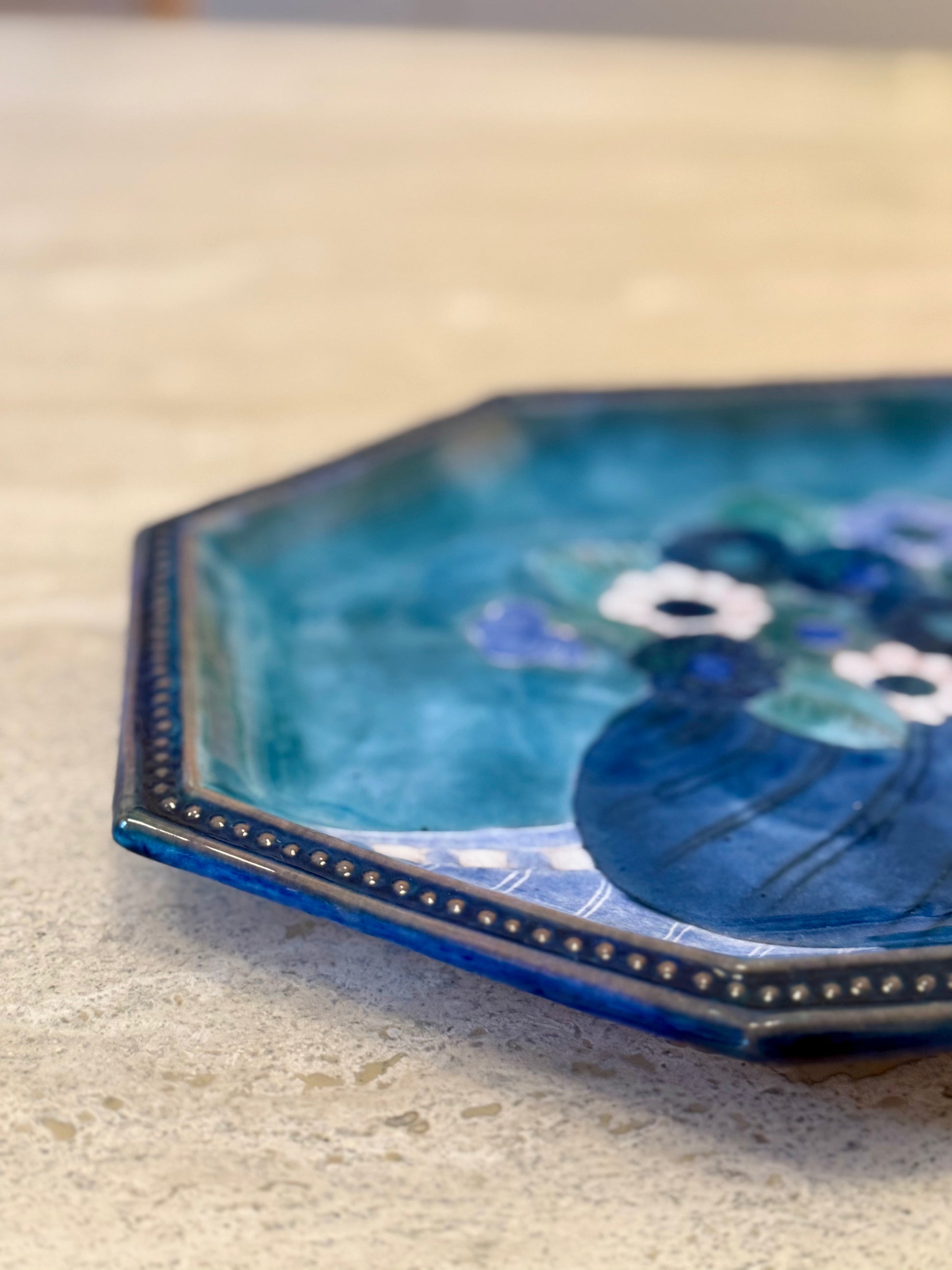 The central decoration depicts a stylised floral bouquet in a vase, rendered in layered tones of blue, green and soft white against a luminous turquoise-blue background. The composition reflects the era’s taste for decorative still lifes, simplified forms and expressive yet controlled colour palettes. The glossy glaze application creates subtle tonal variations, giving the surface depth and vibrancy.