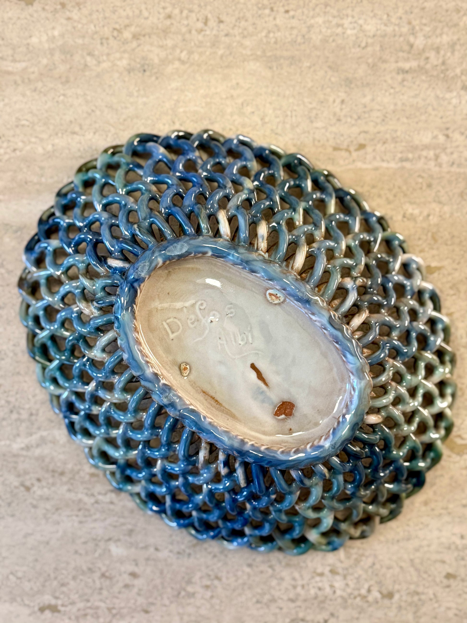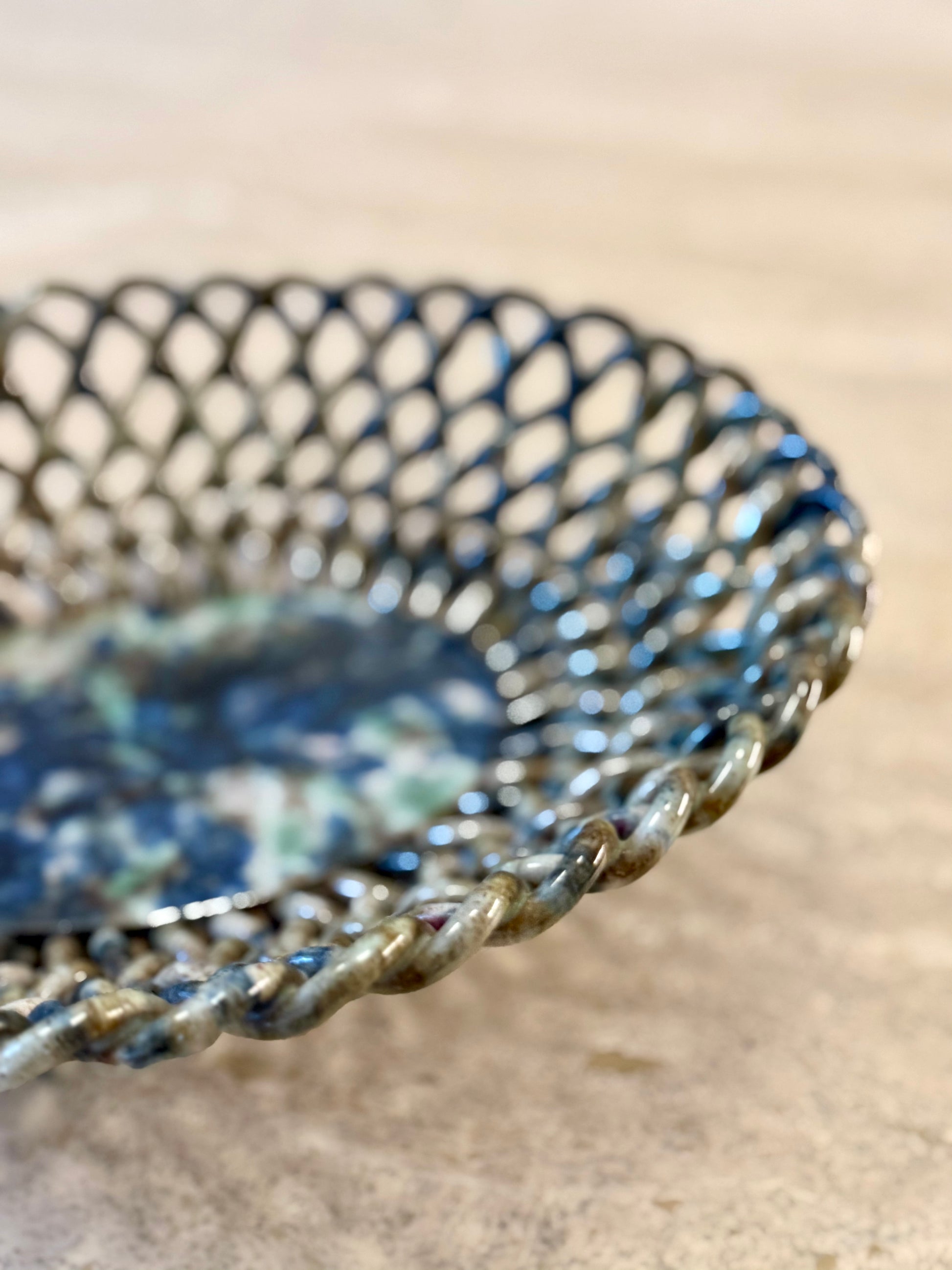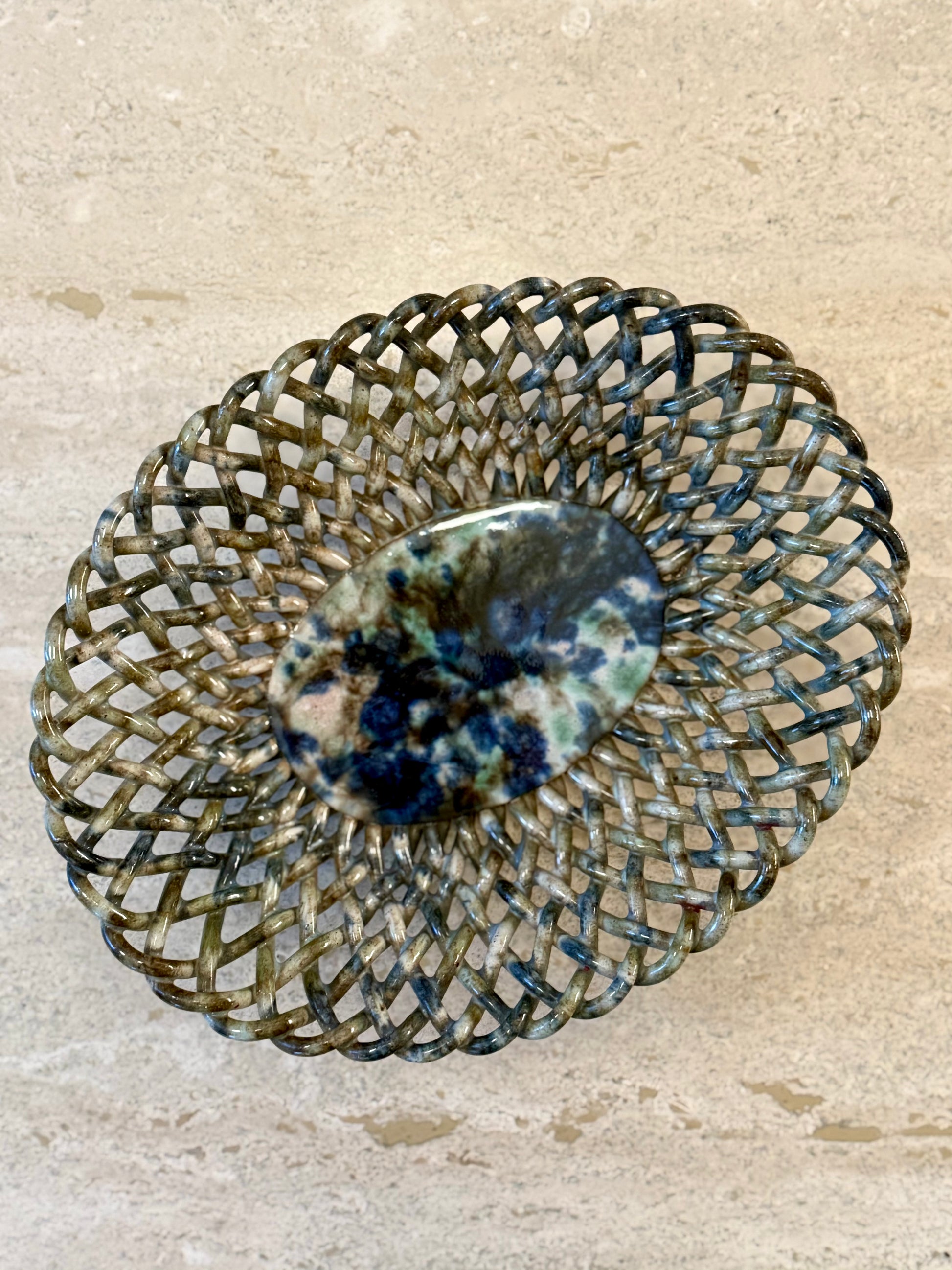 This small ceramic basket features an openwork woven structure, carefully hand-modelled to evoke traditional basketry. The interlaced ceramic strands form a light yet sculptural body, centred around a solid oval base decorated with a richly mottled glaze in tones of blue, green and earthy brown.